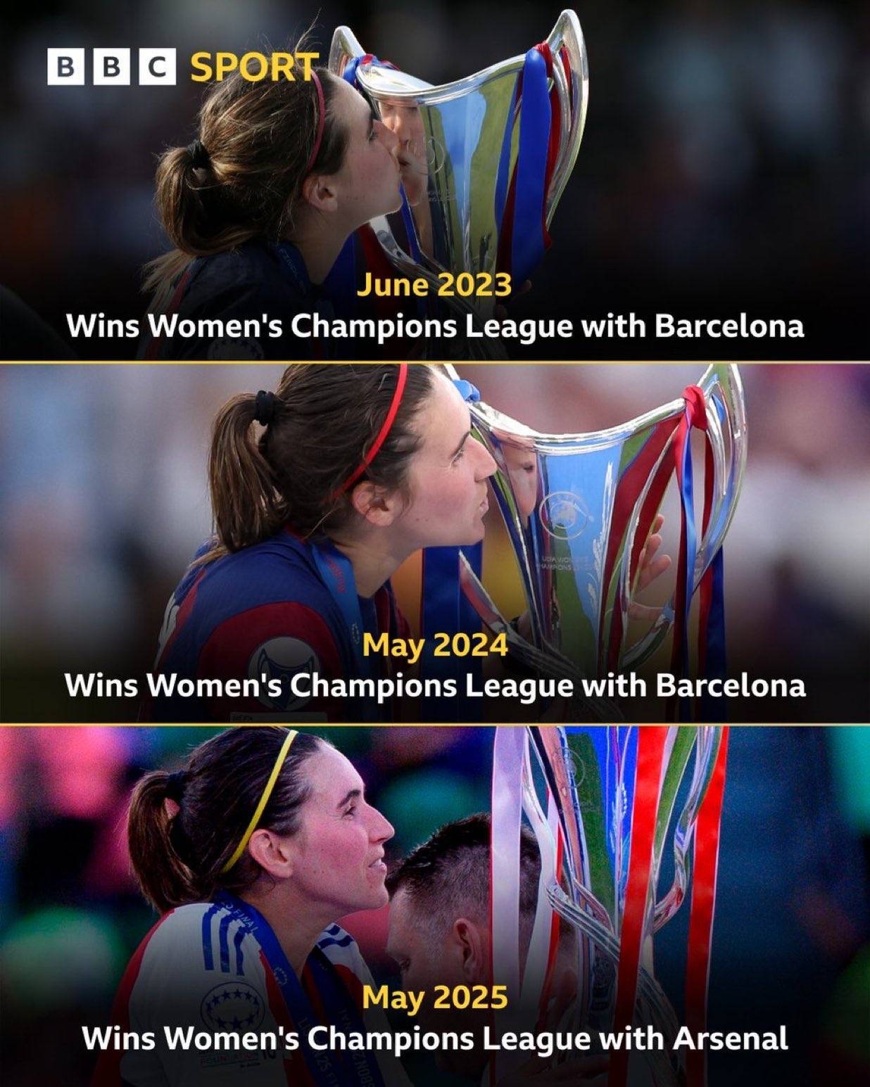 据数据平台OPTA统计,现效力于阿森纳女足的西班牙前锋卡尔登泰在近5个赛季的女足欧冠联赛中,随队获得了其中4次冠军,其中她3次随巴萨女足夺冠,1次随阿森纳女足过关,此外加上本次她已连续三年捧得女足欧冠冠军。